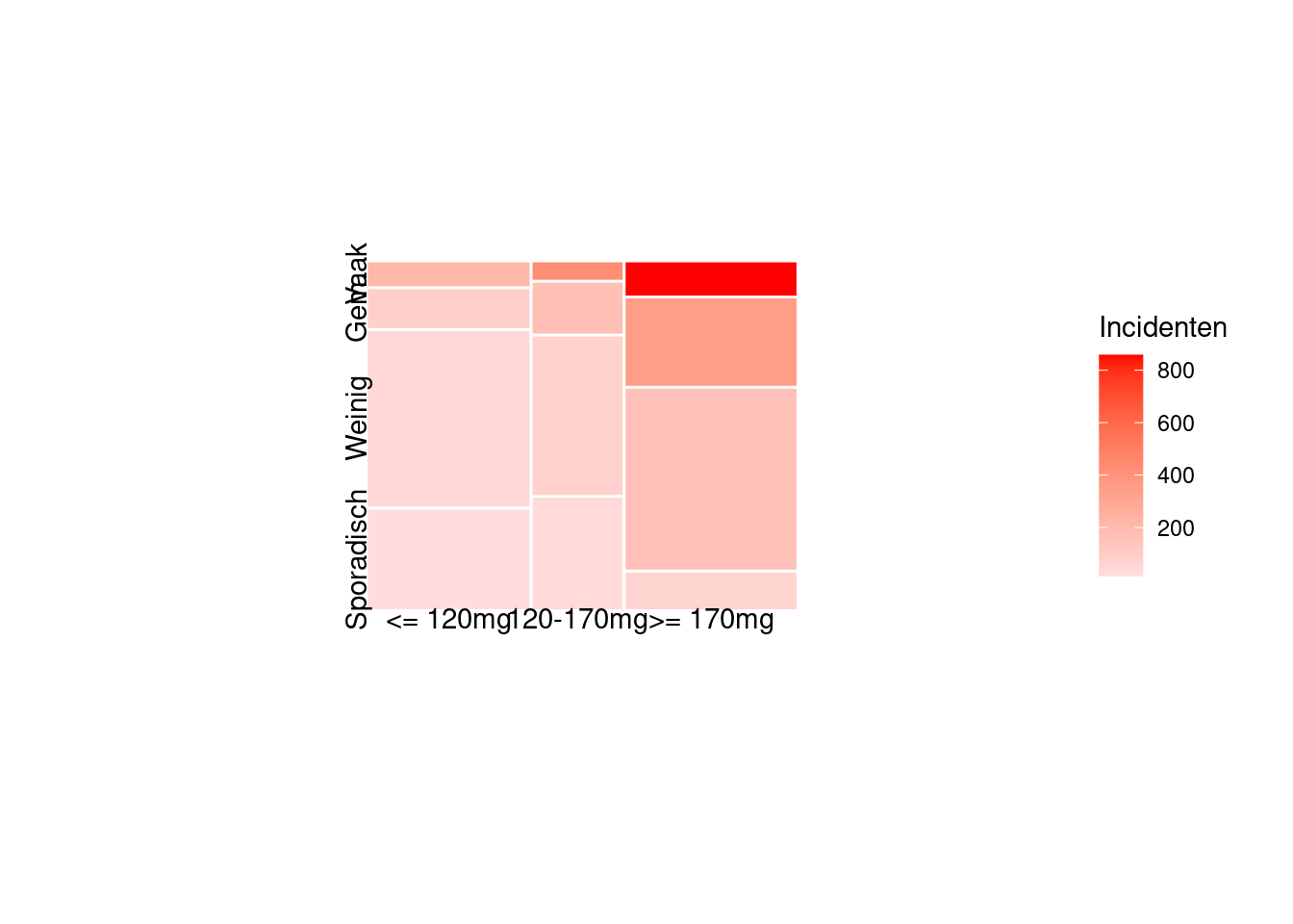 Dit impliceert dat er dus slechts een relatief kleine groep gebruikers is die risico loopt op incidenten; veruit de meeste mensen gebruiken niet veel en niet vaak. Het aantal incidenten betreft dus waarschijnlijk een kleine groep mensen - het is belangrijk om preventieactiviteiten op deze groep te richten.